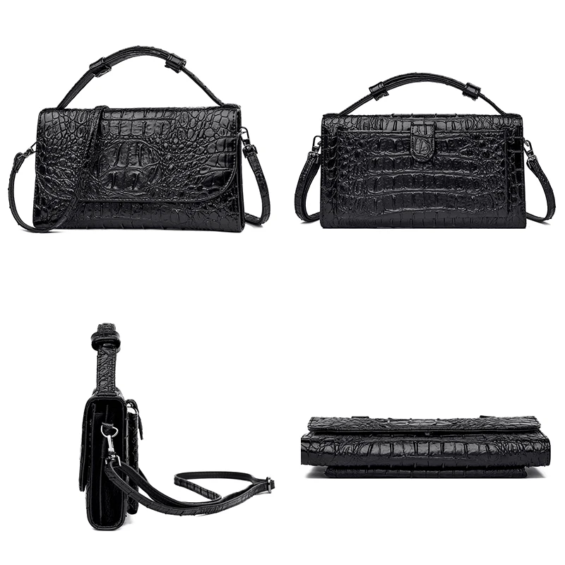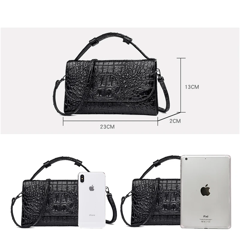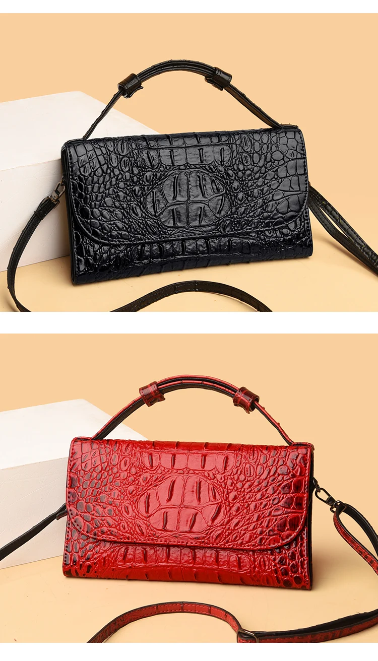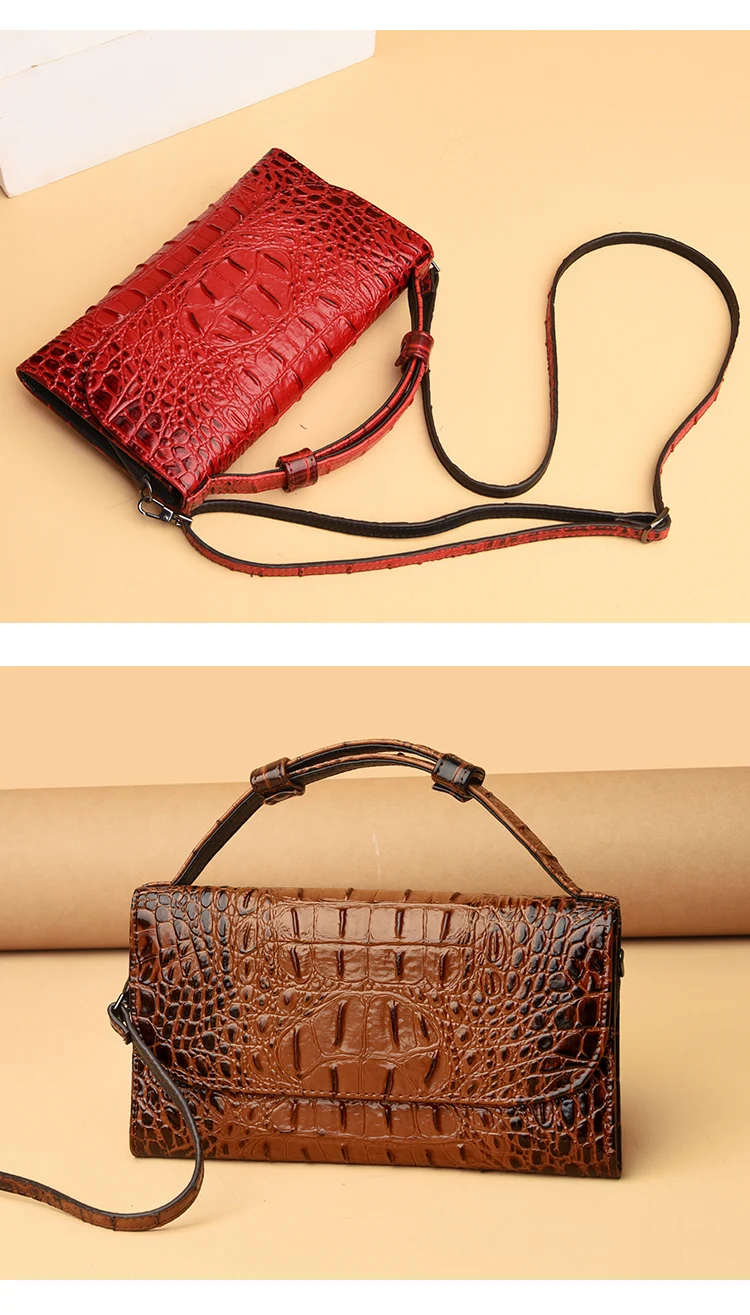 Color: red, black, brown Style: urban simplicity Material: Leather Cortical features: top layer cowhide Popular elements: stitching, crocodile pattern Bag shape: horizontal square Opening method: cover type Carrying parts: soft handle Outer bag type: inner patch pocket Strap root number: single